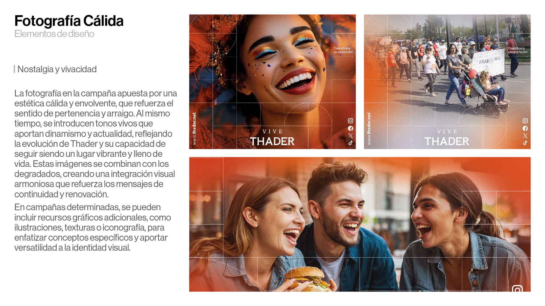 La estructura gráfica se apoya en una retícula geométrica inspirada en la arquitectura de Thader, combinando líneas rectas con formas circulares que remiten a su noria, símbolo del centro. Tradición y renovación conviven en una identidad coherente con el «Vive Thader».